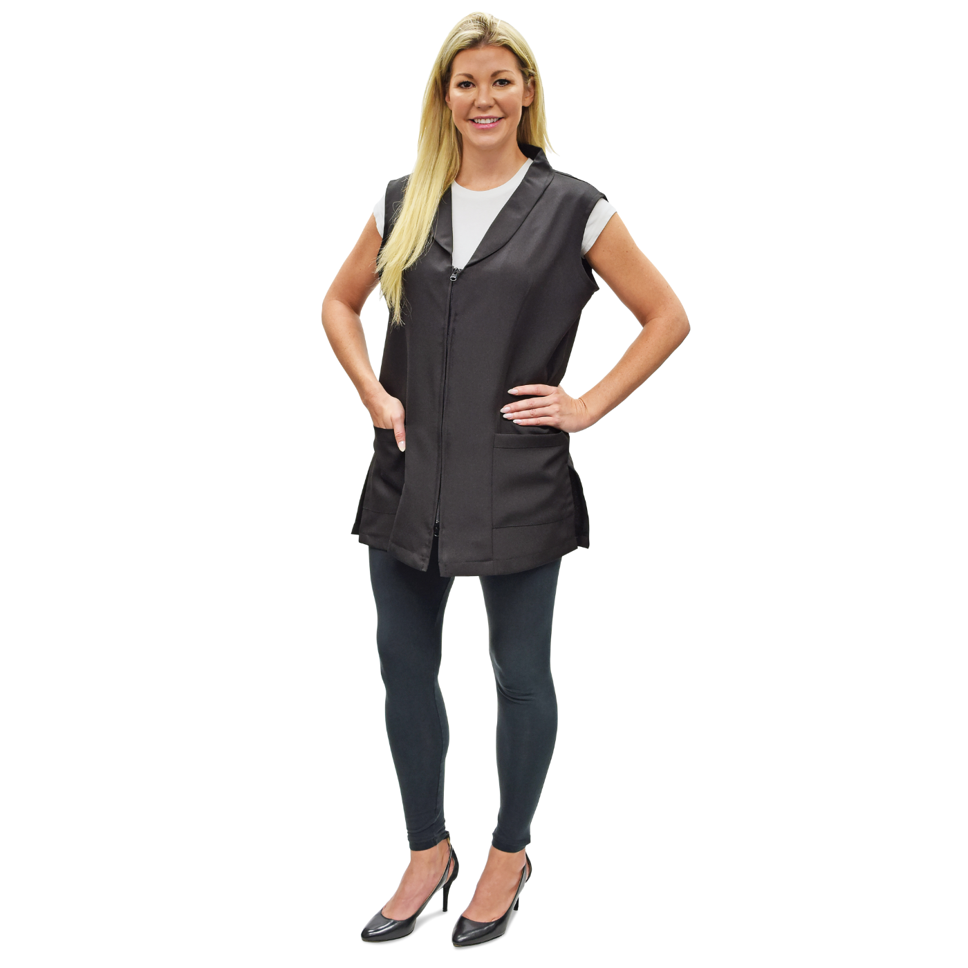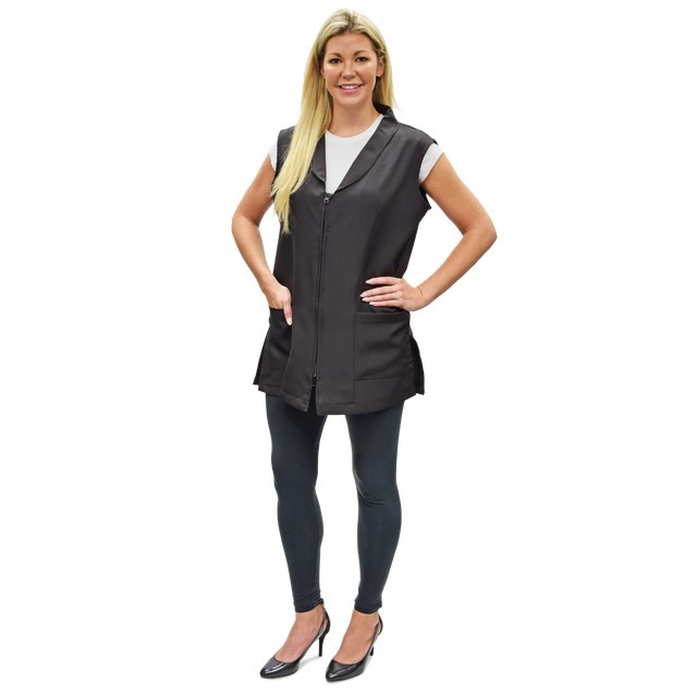 Ideal for stylists and students in any salon setting. Classic vest is made of 100% premium polyester and easily zips on and off with the 2-way front zipper. Comfortable, protective vest has an attractive, V-shaped neckline, a shawl collar, and side vents for breathable, cool, comfort. Water-resistant, static-free vest features two roomy front pockets for storage. One size fits most.