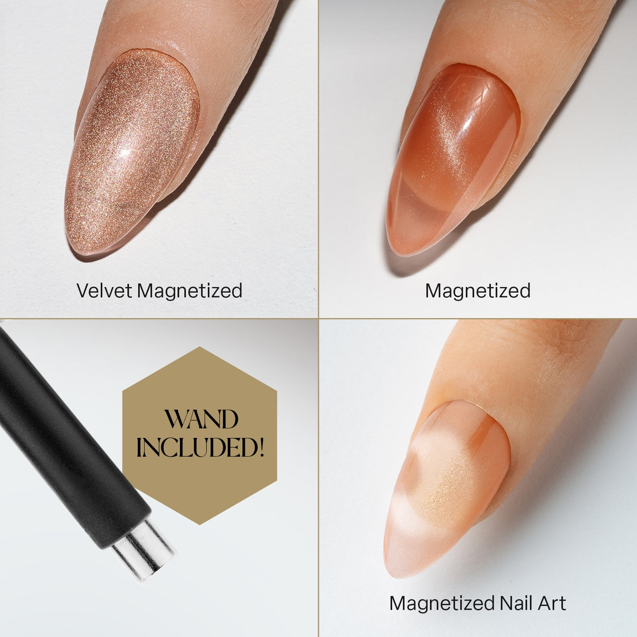 10 Velvet Cat Eye Shades: Every Velvet Cat Eye shade, from an icy bluish white to a luxuriously rich green, leaves a regal and glowing velveteen finish with super-fine magnetic particles suspended in a sheer color gel base to create a completely custom, one-of-a-kind look. Includes Magnet Wand.