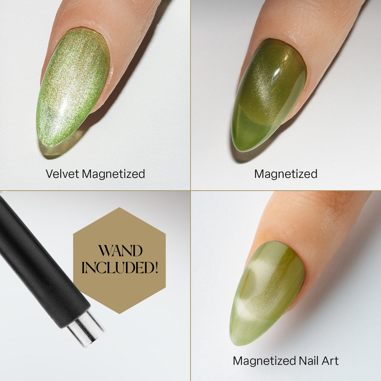 10 Velvet Cat Eye Shades: Every Velvet Cat Eye shade, from an icy bluish white to a luxuriously rich green, leaves a regal and glowing velveteen finish with super-fine magnetic particles suspended in a sheer color gel base to create a completely custom, one-of-a-kind look. Includes Magnet Wand.