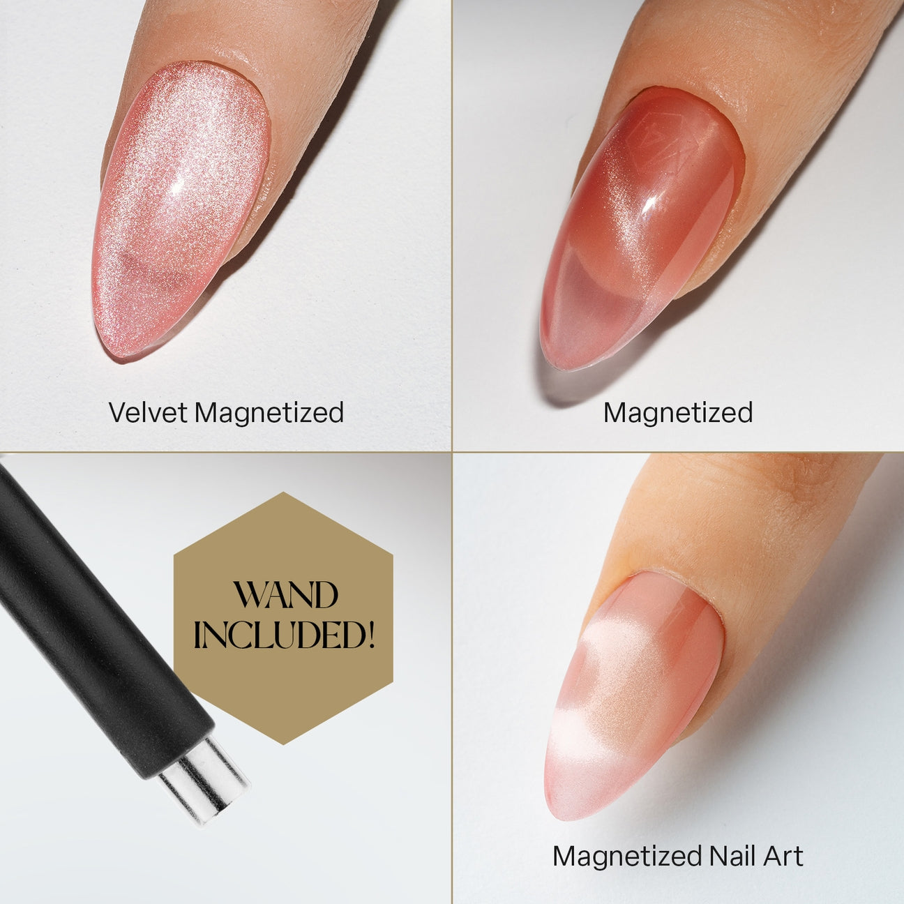 10 Velvet Cat Eye Shades: Every Velvet Cat Eye shade, from an icy bluish white to a luxuriously rich green, leaves a regal and glowing velveteen finish with super-fine magnetic particles suspended in a sheer color gel base to create a completely custom, one-of-a-kind look. Includes Magnet Wand.