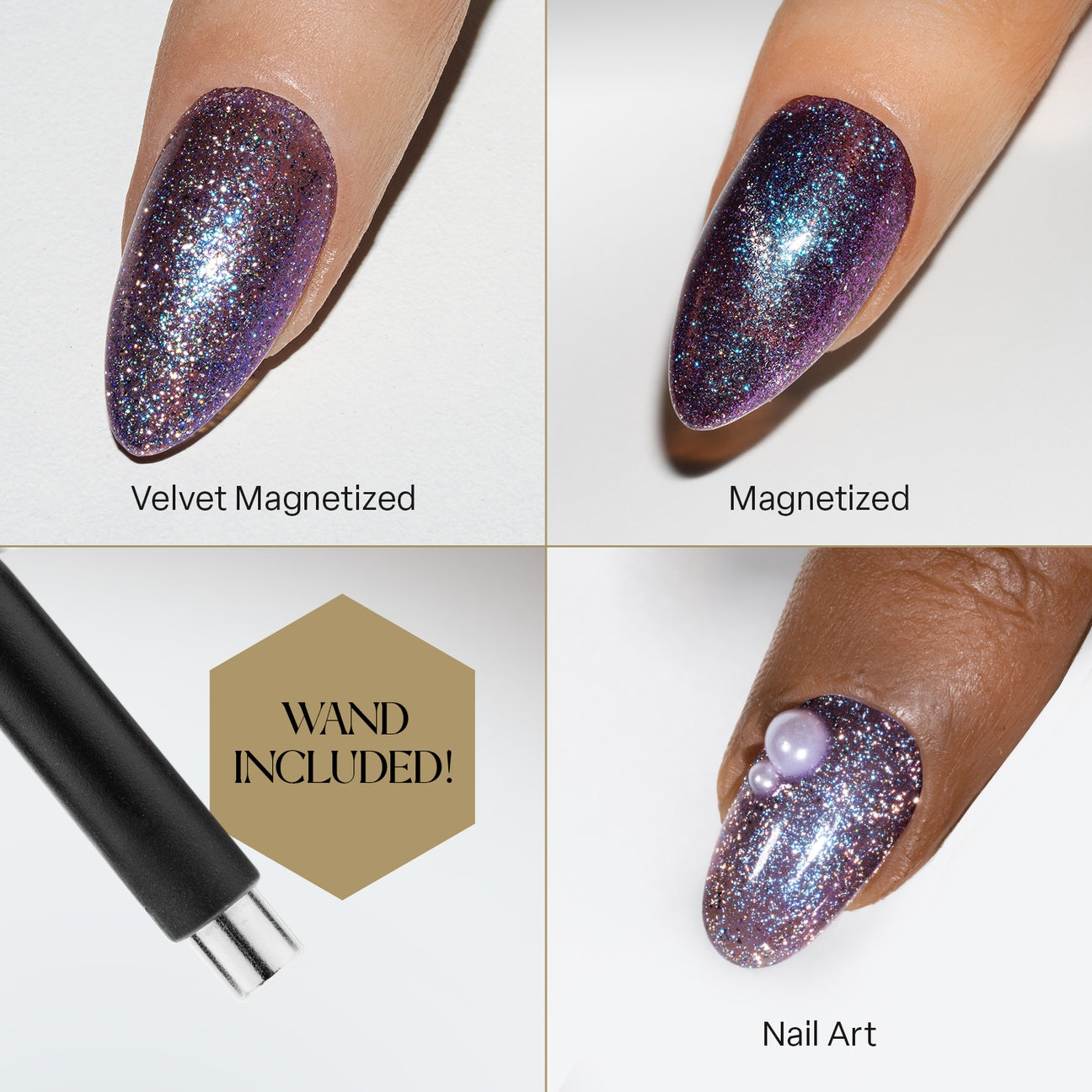 10 Velvet Cat Eye Shades: Every Velvet Cat Eye shade, from an icy bluish white to a luxuriously rich green, leaves a regal and glowing velveteen finish with super-fine magnetic particles suspended in a sheer color gel base to create a completely custom, one-of-a-kind look. Includes Magnet Wand.