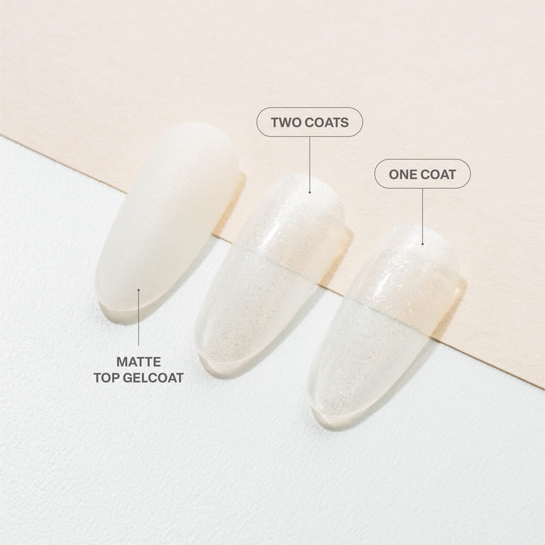 After prepping the natural nail and applying Base Gel coat, apply a layer of Light & Shadow Sheer Gel Couleur then cure for 30 sec LED. Follow with an optional second coat for a more opaque finish, curing for 30 sec LED. Finish with the Après Non-Wipe Top Gelcoat. When applying on Gel-X Tips, NO base coat is needed.