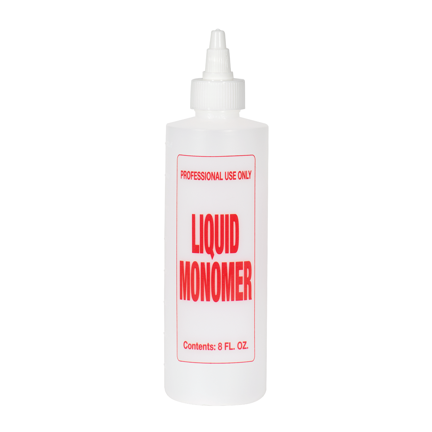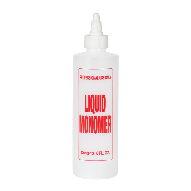 Strong plastic bottle holds 8 oz. of liquid and is conveniently pre-labeled in bright red letters to easily identify the contents. Fillable bottle features measurement scales in the mold and a twist-top cap. Bottle is imprinted with " LIQUID MONOMER" and holds 8 oz. Solution not included.