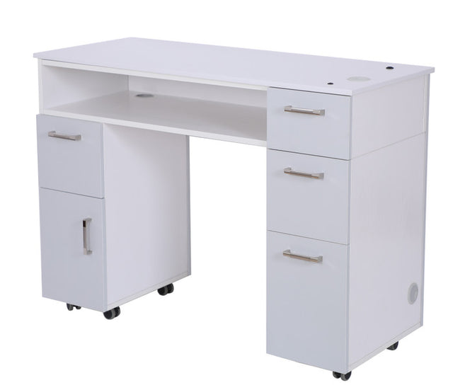 The Milan manicure nail table by Mayakoba is a salon professional table with solid wood construction and an acetone resistant finish. The two-toned wood is a simple yet beautiful design that adds an upscale feeling to your manicure space. With the option of ash wood or ash grey, the accent color is used in a stylish curve that connects with the top of the table. The Milan nail table comes with five spacious drawers and a compartment for a UV dryer or ventilation setup.