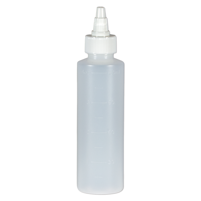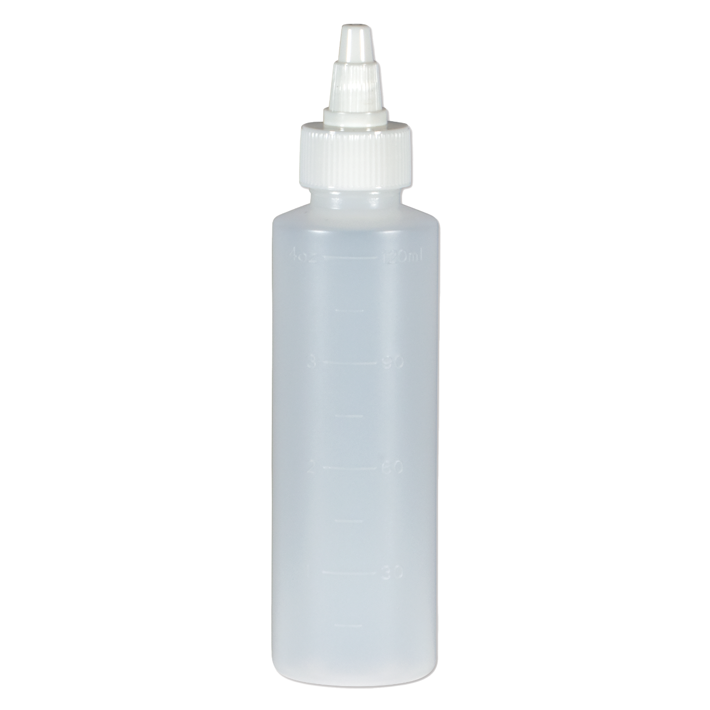 4 oz. translucent, frosted bottle with twist top and measuring scales in the mold.
