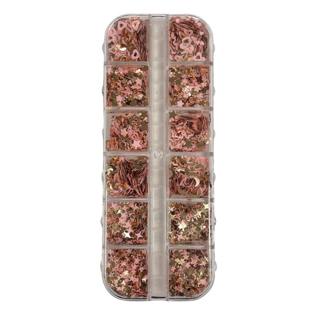 Unleash your inner nail artist with 12 Grids Sequin Mix in God and Rose Gold! These nail decorations feature a gorgeous mix of hearts, and flowers, moons perfect for creating unique and eye-catching designs. Let your creativity run wild with this must-have addition to your nail collection!