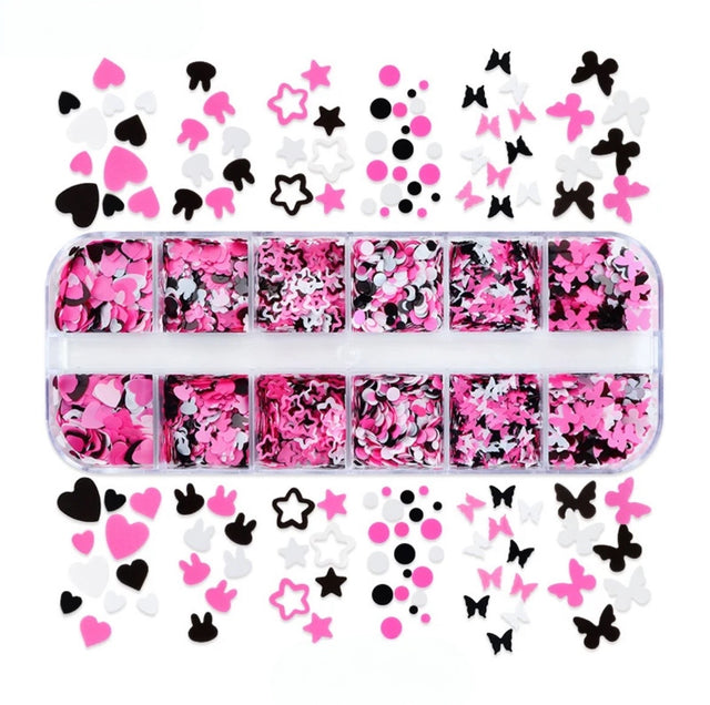 Jazz up your nails with our Sequin 12 Styles! Express your personality with Pink, Black, and White designs including butterflies, circles, hollow stars, bunnies, and hearts. Be the talk of the town with these unique nail decorations.