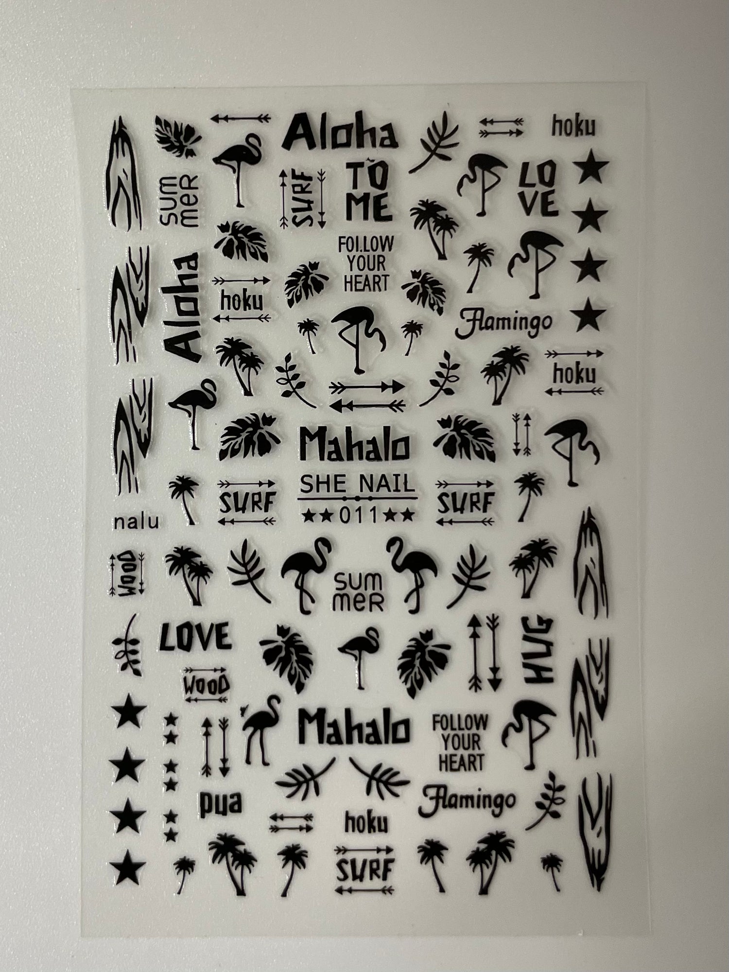 Nail Sticker-black flamingoes, "love", "surf", "Aloha", "hoku", "summer" palm trees, leaves, stars